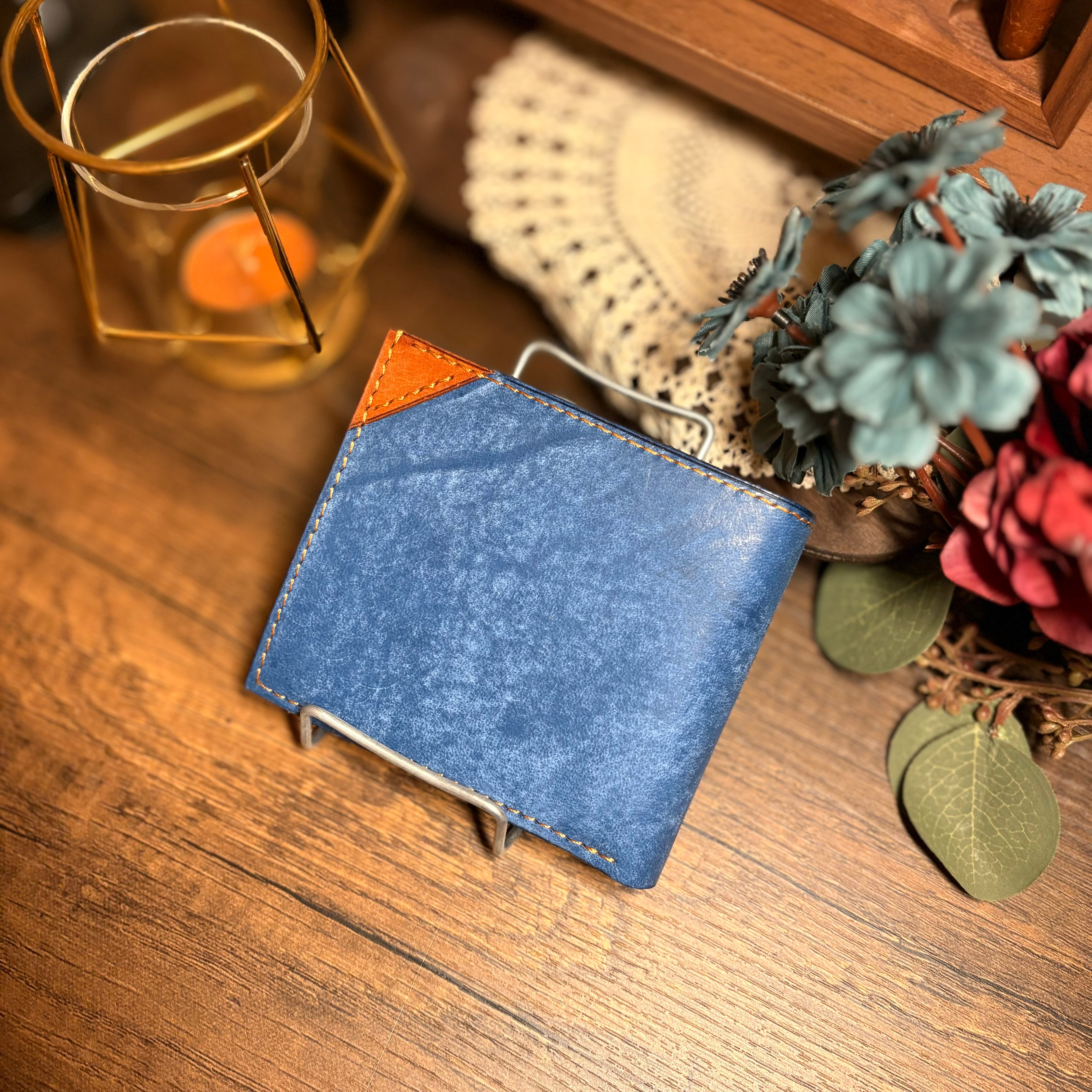 深みのあるブルーとアクセントとしてブラウンカラーが融合した二つ折り財布。